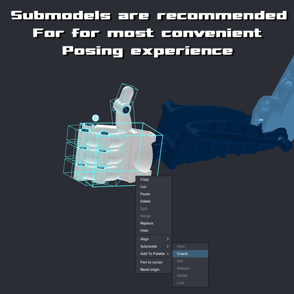I was unable to fix a bug with the wrists that causes them to wig out when trying to pose them so my best recommendation if to submodel the entire hand and pose it via editing that submodel for most optimal posing experience. Otherwise, just do as you wish with them!