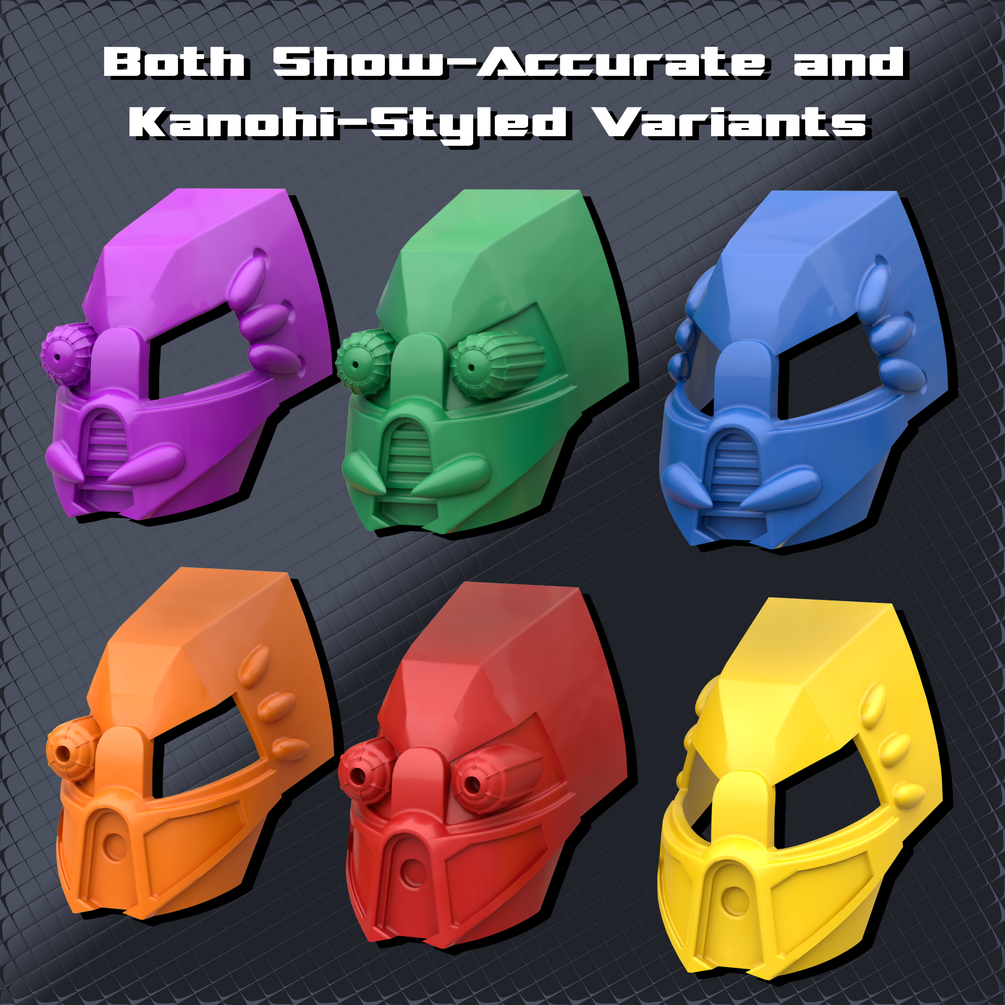 I present the Kanohi Khekk, the mask of contact-mimicry. It allows the wearer to change their limbs into anything they made physical contact with within a certain duration of time. Due to the fact these models are fairly high-poly from being solid meshes this pack contains two zip files, one with the show-accurate model of the mask, and one with a more Kanohi-fied style of mask. If you only want the show-accurate version, get the pack with those three, and if you want the stylized version, get the pack with those three. This way you aren't stuck with ones you won't use taking up space.